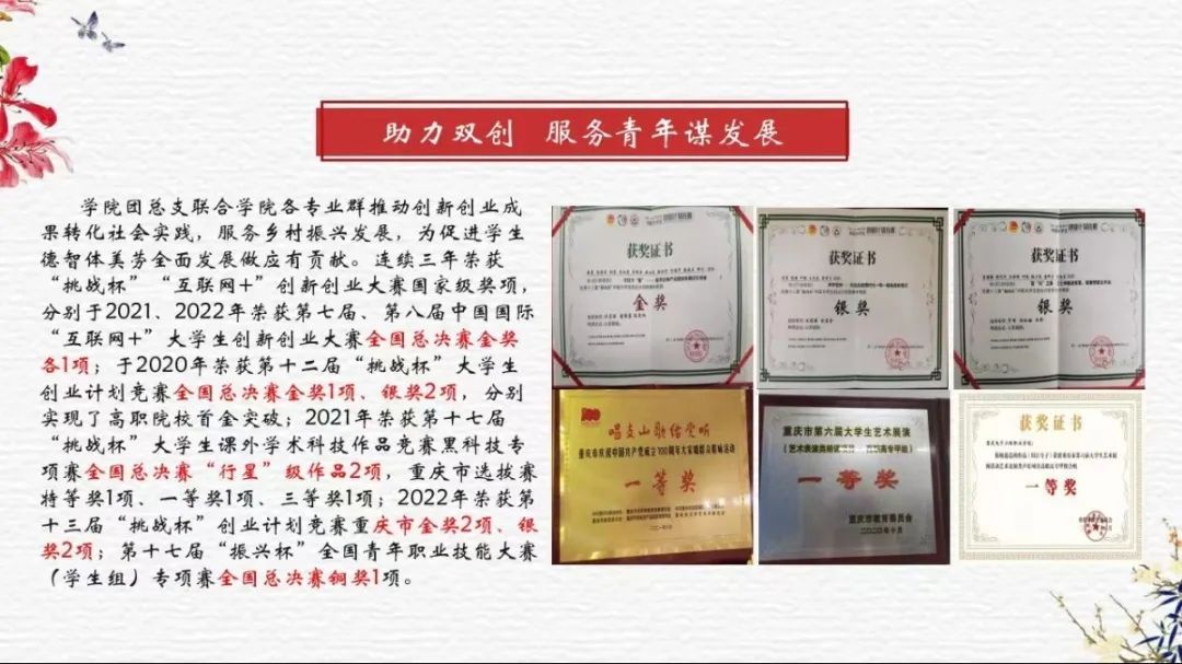 助力双创,服务青年谋发展。财经管理学院团总支加强创新创业社会实践教育,引领青年学生在实践中受教育、长才干、做贡献,培育高职院校卓越工匠和时代精英。进行创新创业开云电子平台_开云(中国)和项目孵化,建立“学生实践——教师科研——科技创新”师生循环互动模式,开展2022年大学生创新创业培训和创业计划竞赛培训,2022年组织双创培训共计528人次,共计培养36名国家级双创冠亚军和一批重电“创客”榜样人物,孵化三家大学生创业企业;双创教育与实践成果推广取得了显著成效,得到了学校、重庆市的认可,多次承办组织重庆市“双城青才讲堂”“重庆青年创业导师高校行”等专题培训。