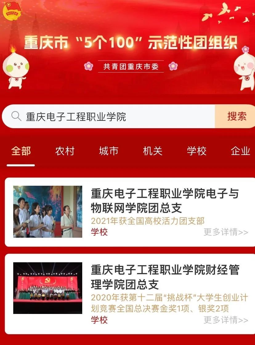 近日,共青团重庆市委公布了重庆市“5个100”示范性团组织名单,我校电子与物联网学院团总支和财经管理学院团总支获重庆市首批“5个100”示范性团组织。