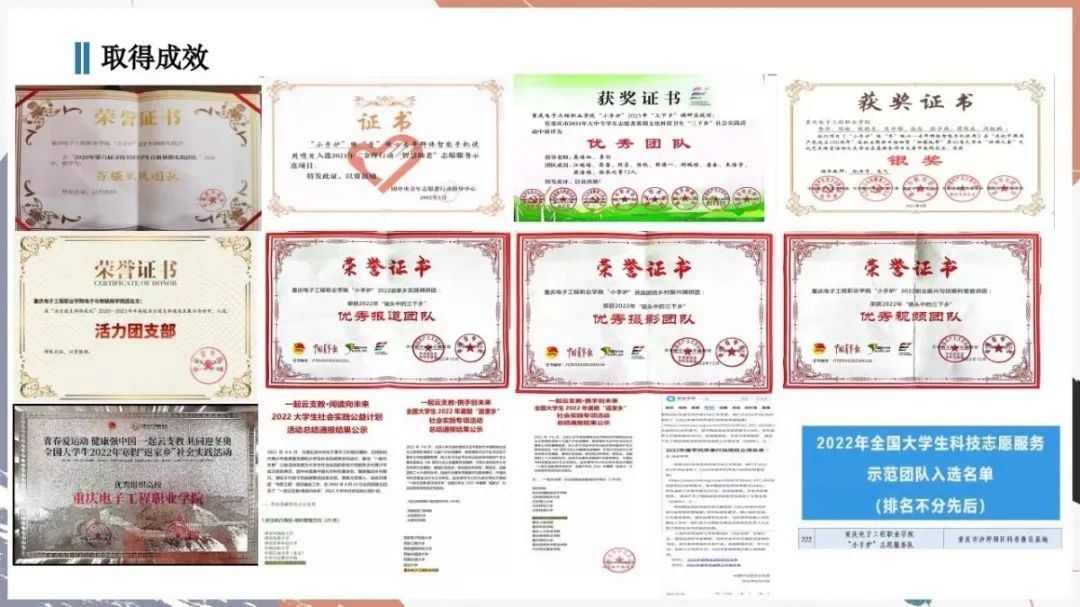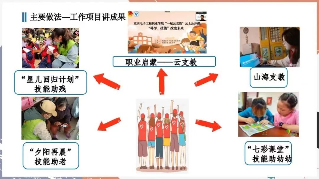 电子与物联网学院团总支以团中央关于实践育人和大学生社区实践的相关文件精神为指导,统筹班级团支部、专业社团特设团支部、志愿服务队特设团支部共同参与,最终形成了“技能助老”“技能助残”“技能助教”等一系列范围广、影响大、可持续的“校-社”协同实践育人项目,截止2023年4月,团总支下属16个团支部入选“沙坪坝区千名基层服务青年优才派遣计划”(全区第一,占沙坪坝区入选比例的23.8%),5个专业社团特设团支部参与7项团中央志愿服务示范项目、团队,覆盖社区逾20个。
