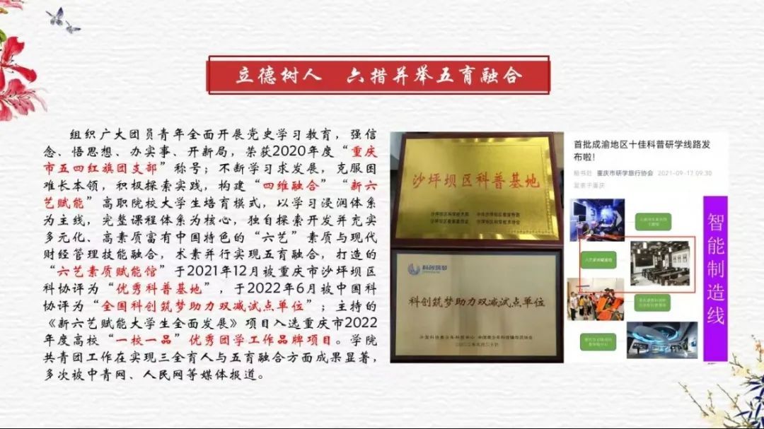 锐意进取,展现共青团良好风貌。财经管理学院团总支不断深化改革、锐意进取、六措并举五育融合,展现共青团良好风貌。夯实根基深化组织建设,全面组织二十大精神专题学习教育64场。文化传承厚植家国情怀,2022年开展文化传承实践教育活动100余场,参训学生共计13020人次。活动蕰育塑造精神品格,2022年开展线上线下科技文化体艺活动200余场,学生参与率100%。实践承栽培育工匠精英,创新创业成果突出,多次荣获国家级金奖。精准帮扶关爱学生成长,毕业生就业培训全覆盖,团干部结队帮扶家庭困难学生解决实际问题。探索实践构建育人模式,三全育人、五育融合教育体系完善,多次被中青网、人民网等媒体报道。