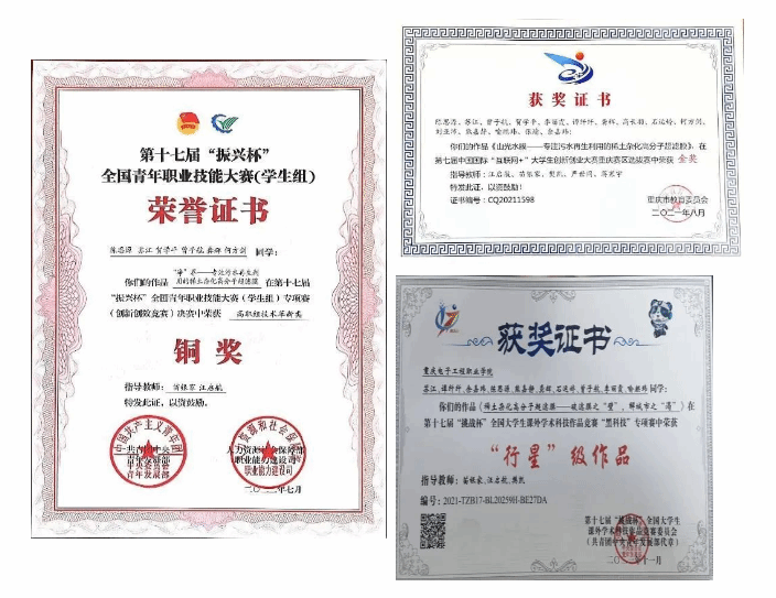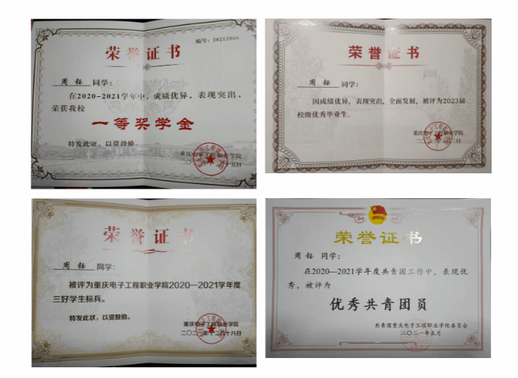 除了专业学习,在校期间他踊跃参加创新创业各项赛事,在 2021 年第七届中国国际“互联网+“大学生创新创业大赛中荣获金奖,夺得重庆职业院校在该赛事首个金奖,实现了零的突破!同时在第十七届“挑战杯”全国大学生课外学术科技作品竞赛“黑科技”专项赛、第十七届“振兴杯”全国青年职业技能大赛学生组专项赛等多项竞赛中均有斩获,共累计获得国家级奖项 8 次,省部级奖项 12 次,并因此获得重庆电子工程职业学院“卓越技术技能人才”奖励计划“创业达人”荣誉称号。通过以赛促学,将理论转化为实践,以第一作者身份发表论文 2 篇,申请个人软著 2 项。