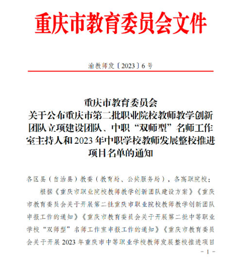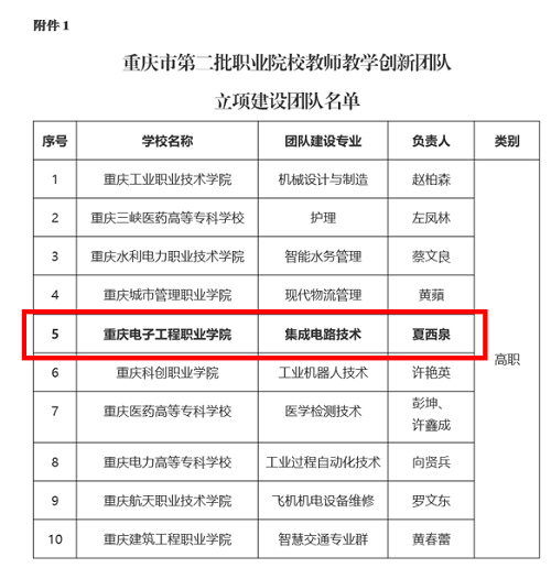 近日,重庆市教育委员会发布《关于公布重庆市第二批职业院校教师教学创新团队立项建设团队、中职“双师型”名师工作室主持人和2023年中职学校教师发展整校推进项目名单的通知》,确定我校“集成电路技术团队”等10个团队为重庆市第二批职业院校教师教学创新团队(高职)立项建设团队。