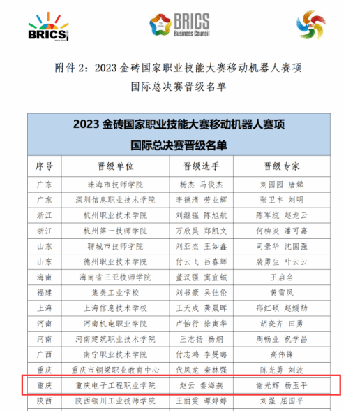2023年8月22日,2023年金砖国家职业技能大赛(金砖国家未来技能挑战赛)移动机器人赛项区域选拔赛圆满结束,此次区域选拔赛采用线上分赛场的形式进行,主赛场设置在赛项技术支持单位所在地,各参赛单位均为分赛场,各分赛场与主赛场保持线上实时互联。全国各分赛场移动机器人赛项63支队伍126名选手以线上视频连线的形式参赛,选手、裁判员、工作人员、赛项组织者等均按照赛项组委会要求及时办理相关手续,确保比赛的公正性和公平性。2023年10月10日,经过裁判组裁决,金砖国家工商理事会技能发展工作组审核批准,公布了比赛成绩及晋级名单,我校智慧健康学院教师赵云、秦海燕组成的重庆电子工程职业学院代表队脱颖而出,荣获重庆市第二名,并成功晋级全国决赛。