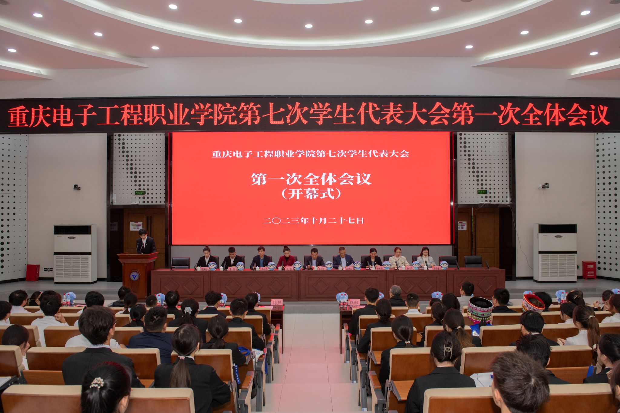 2023年10月26-27日,重庆电子工程职业学院第七次学生代表大会在博远厅召开。党委书记孙卫平,党委委员、副校长冉学农,党委委员、党委组织部部长疏勤,党委委员、党委宣传部部长徐继燕,党委学工部副部长王永中,工会常务副主席唐莉,重庆市学生联合会驻会执行主席王澈出席会议,校团委副书记范可佳,校学生会执行主席张静怡、各二级学院党总支书记、副书记、学管科科长、团总支书记和学生代表共300余人参加本次会议。