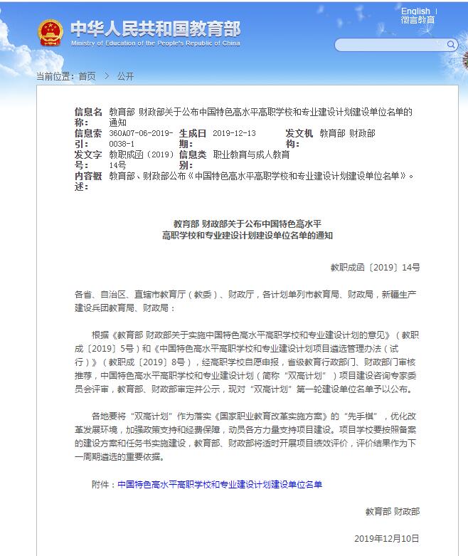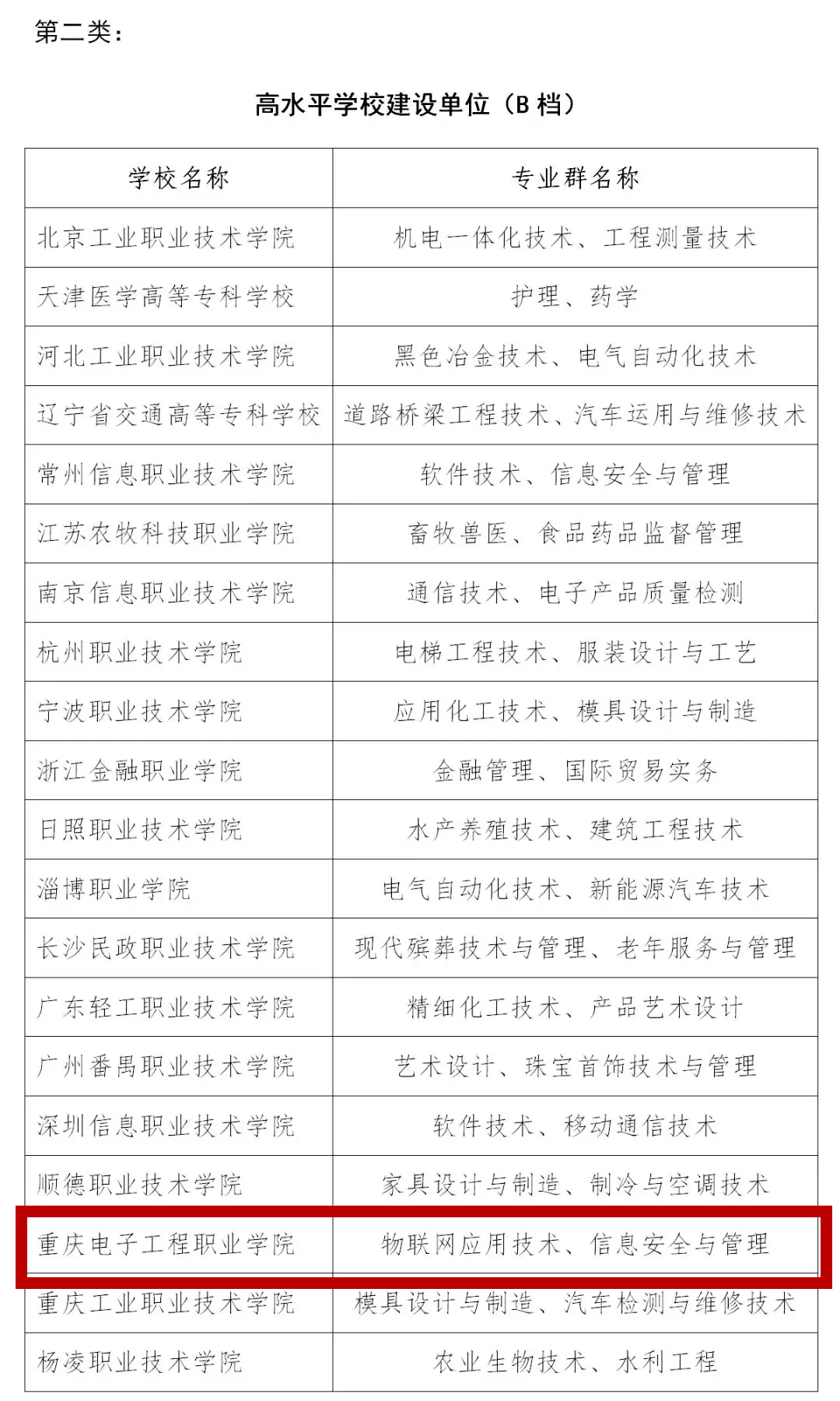 12月10日,教育部 财政部发布《关于公布中国特色高水平高职学校和专业建设计划建设单位名单的通知》。重庆电子工程职业学院成功入选中国特色高水平高职学校建设单位。