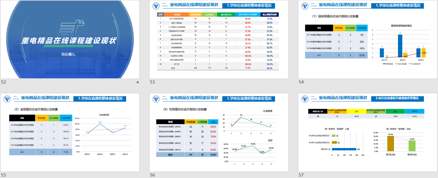 其次,她分析了重电在线课程建设的现状。对我校在线课程的线上开设率、国内开放平台开课率、国家级在线课程申报成功率、省级在线课程认定通过率、各二级学院校级在线课程占比等整体建设情况进行了数据分析,还对依托在线课程开展课堂教学改革的情况进行了剖析,如:课程负责人参与“金课堂”建设或教学能力比赛的人数占比,同时,指出了校级在线开放课程建设中存在的突出问题。