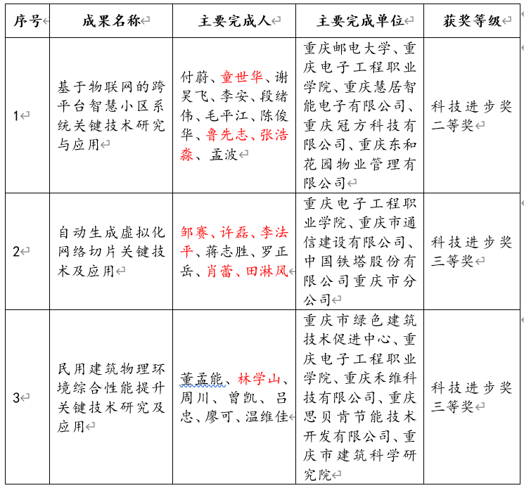 学校高度重视2020年度重庆市科学技术奖申报工作,精心组织、深入论证。在全校科研工作人员的共同努力下,学校共提交5项申报成果,最终3项成果获奖,获奖率为60%,年度获奖数量创学校历史新高。其中,“自动生成虚拟化网络切片关键技术及应用”成果为我校首次以第一完成单位身份获重庆市科技进步奖,实现历史性突破。