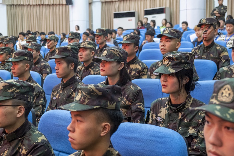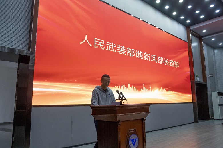 人民武装部部长谯新风致辞,今年是中国共产党建党100周年,正是在中国共产党的正确领导下,中华民族才健步走在中华民族伟大复兴的伟大征程上,大家要牢记自己曾经的军人身份,要始终坚持党的绝对领导,勇担使命,扎实工作。第三届平安校园服务队队长陈壹灵和迷彩青年工作站站长黄悦朗分别发言,分享了收获和感想,并希望下一届全体队员继续努力,不负众望。