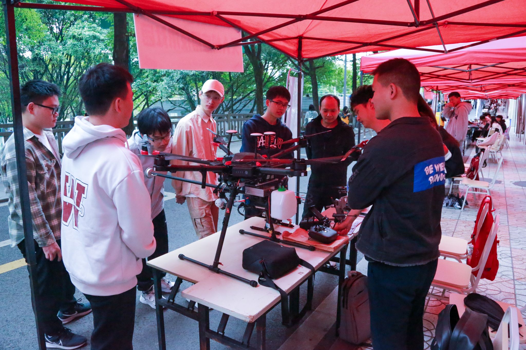 活动现场,无人机应用技术社团和机器人俱乐部社团携自己的科技创新类作品布展,吸引了大量的科研学者、大中小学生前来参观交流。