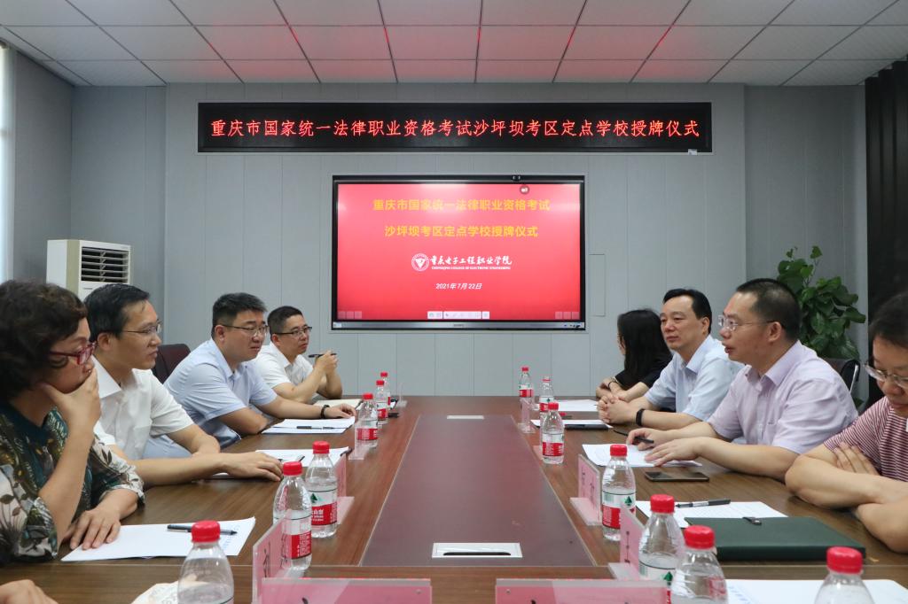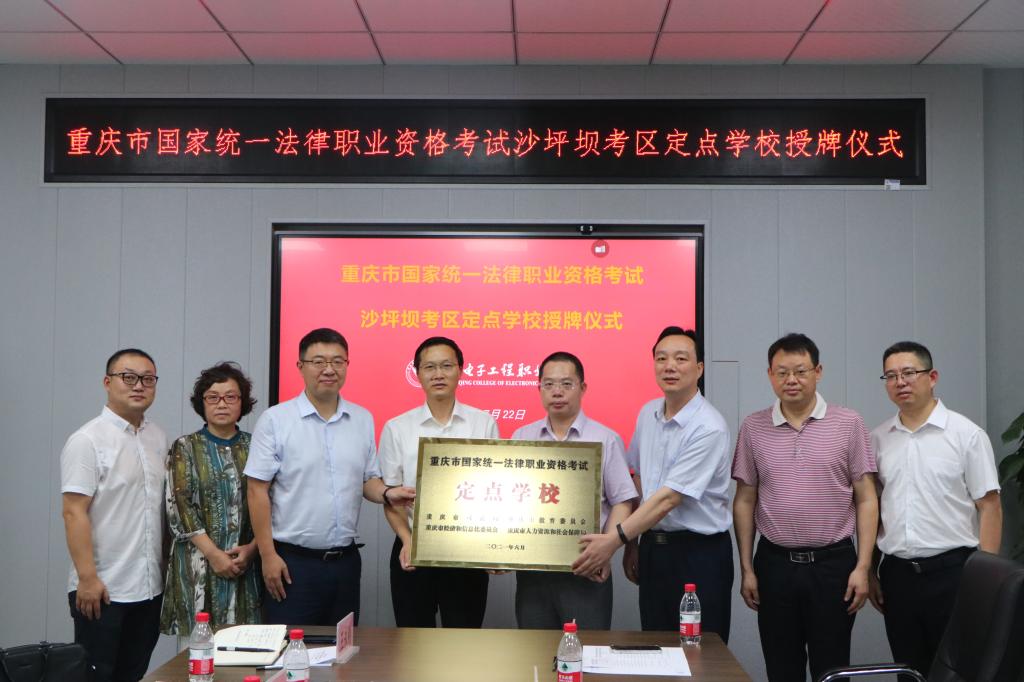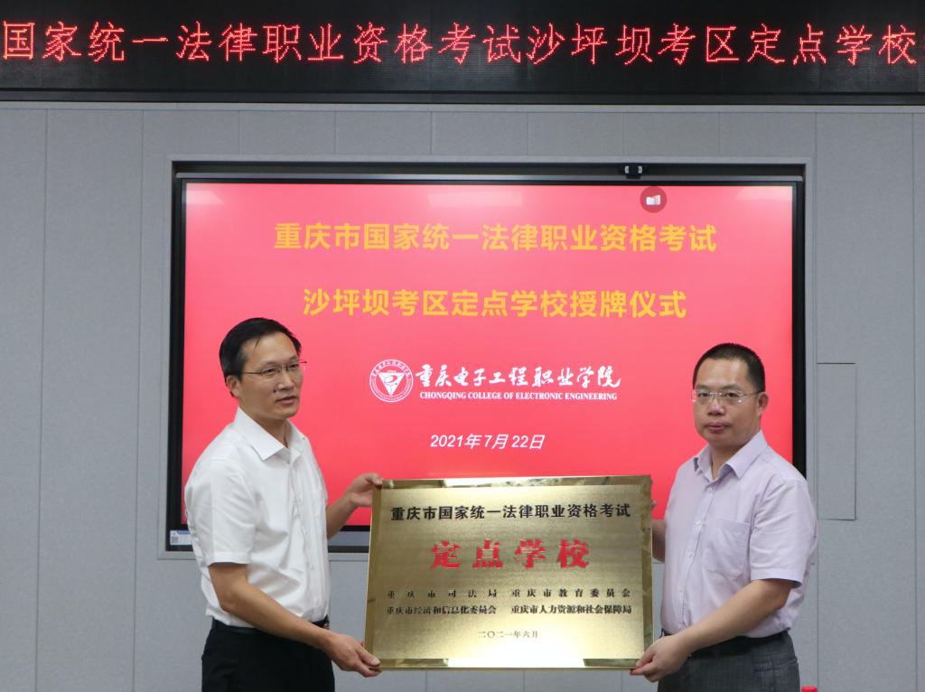 为进一步加强重庆各考区与考点院校的合作力度,经市司法局、市教委、市经济信息委、市人力社保局共同确定,决定授予重庆电子工程职业学院为“重庆市国家统一法律职业资格考试定点学院”并授牌,7月22日,在重庆电子工程职业学院人工智能与大数据学院14-508c隆重举行了授牌仪式,出席仪式的有重庆市司法局副局长谢建军、重庆电子工程职业学院党委副书记龚小勇、重庆市司法局法律职业资格管理处处长陈晓琴,区司法局党组书记秦湛毅,重庆电子工程职业学院人工智能与大数据学院院长武春岭,重庆电子工程职业学院双高办副主任何欢,以及市局法律职业资格管理处、重庆电子工程职业学院和区司法局的相关同志,仪式由区司法局党组书记秦湛毅主持。