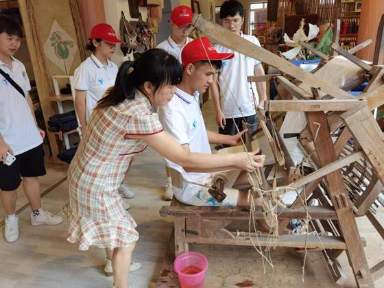 走出博物馆,志愿者们来到了荣昌夏布非遗文化园,在这里志愿者见到了荣昌夏布非遗传承人颜先英女士,颜女士祖上一直是夏布的传承者,颜女士向志愿者展示了腰机编织夏布的过程,手前推,腿部伸缩,经线便按规律上下分开,看着飞梭在颜女士手中来回互换,飞梭带着纬线在穿插于经线之间,整个过程可谓是行云流水。在颜女士的指导下,志愿者也亲身体验了一次织布的过程,志愿者感受到编织的艰难,技术的宝贵,要将手艺永远传承下去。
