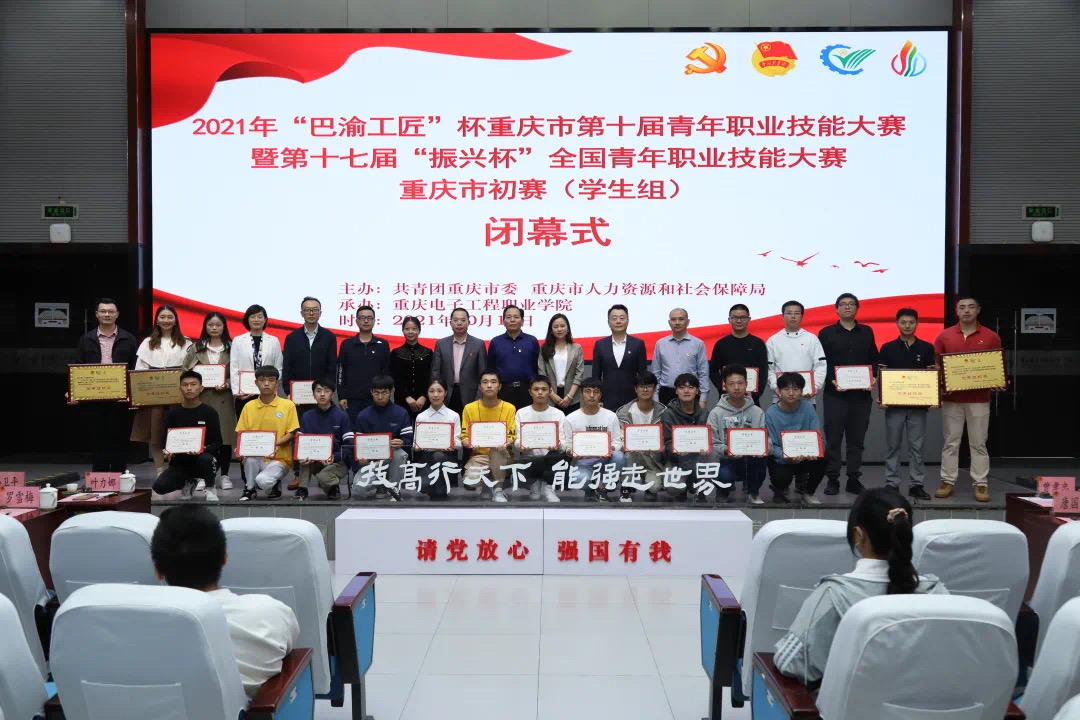 随后,党委书记孙卫平为闭幕式致辞。孙卫平在致辞中表示,举办青年职业技能大赛是深入贯彻落实党的十九届五中全会精神的一次实际行动,也是对重庆职业院校整体水平的实践检验和成果展示。“回顾本次大赛的过程,结合比赛的成绩,我们共同欣赏和感受了一场激烈的比赛。选手们全身心投入比赛,有效地提升了职业技能、磨砺了心理素质,赛出了风格、赛出了水平、赛出了精气神。通过大赛,我们结交了朋友,交流了经验,取得了预期的成效。”紧接着,重庆市人力资源和社会保障局二级巡视员曾孝忠宣布比赛结果。重庆电子工程职业学院、重庆工业职业技术学院、重庆公共运输职业学院、重庆市工业技师学院、重庆市轻工业学校等榜上有名。最后,共青团重庆市委、重庆市人力资源和社会保障局领导为大赛获奖作品、优秀指导教师、优秀组织单位颁奖。