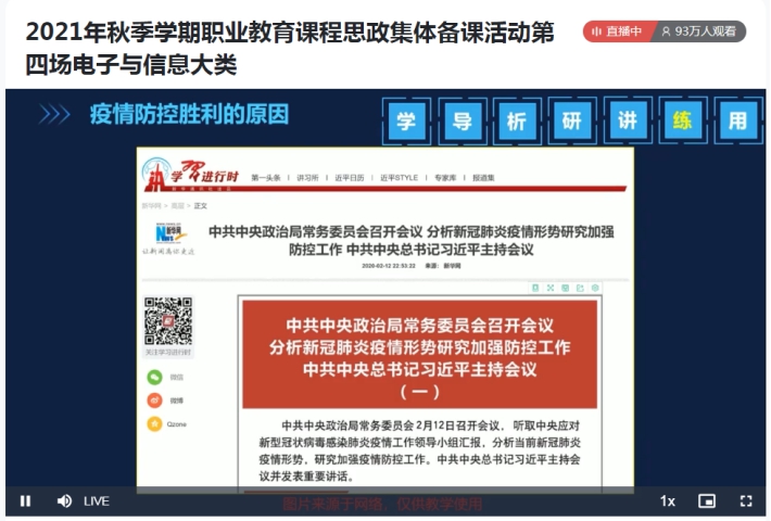 为深入学习贯彻习近平总书记重要指示精神和全国职业教育大会精神,落实《高等学校课程思政建设指导纲要》,深化职业院校对课程思政的认识与理解,发挥课程思政示范项目的引领作用,总结推广职业教育课程思政经验做法,大力提升职业院校电子与信息专业大类相关专业课程思政建设,根据教育部职业教育与成人教育司《关于开展职业教育课程思政集体备课有关工作的通知》要求,我校联合深圳职业技术学院于2021年9月25日开展线上集体备课会。