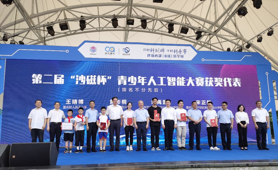9月15日,2021年沙坪坝区全国科普日主题宣传活动暨西部(重庆)科学城公众科学素质促进联合体成立启动仪式在陈家桥街道学府广场举行。活动现场对第二届“沙磁杯”青少年人工智能大赛获奖代表颁奖,重庆市沙坪坝区委常委、区政府党组成员蔡焘、重庆电子工程职业学院副校长刘成俊、重庆市沙坪坝区科协党组书记、主席向丽华等领导出席颁奖仪式并为获奖项目颁奖。