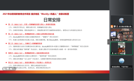 朱爱民先生致辞介绍了谷歌高职教育合作项目的初衷及发展,介绍了谷歌从全国100多所院校中选择我校的原因并鼓励学员们在为期五天的学习中能突破自我、有所收获。最后,我校教务处处长王正勇教授宣布谷歌2021年度重庆地区高职教育合作项目—“Blockly+机器人”创意训练营正式开营。