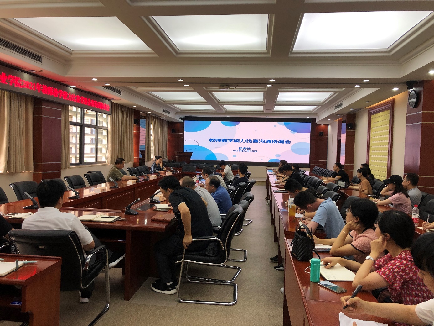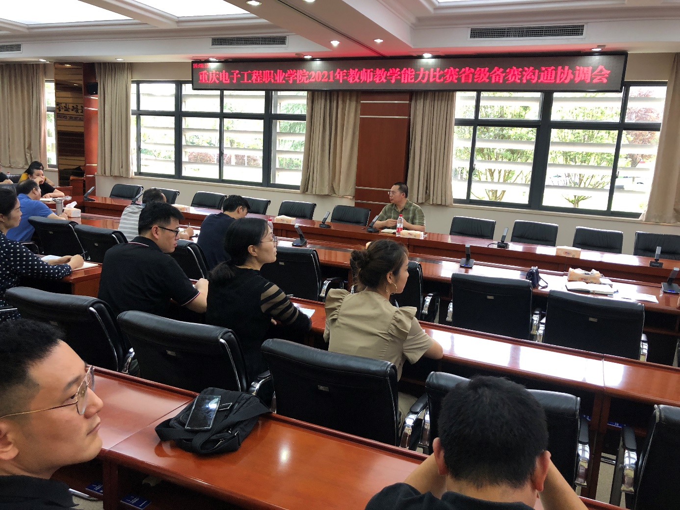 2021年6月30日下午3点30分,2021年教师教学能力比赛省级备赛沟通协调交流会在博润厅召开。出席会议的有:党委副书记龚小勇,教务处处长王正勇、副处长代才莉,建筑与材料学院院长周国清、副院长边凌涛,通信工程学院副院长刘良华,人工智能与大数据学院副院长童世华,智能制造与汽车学院副院长叶勇,马克思主义学院副院长冉鑫,数字媒体学院副院长谢永,以及教师教学能力比赛参赛团队成员。代才莉主持会议。