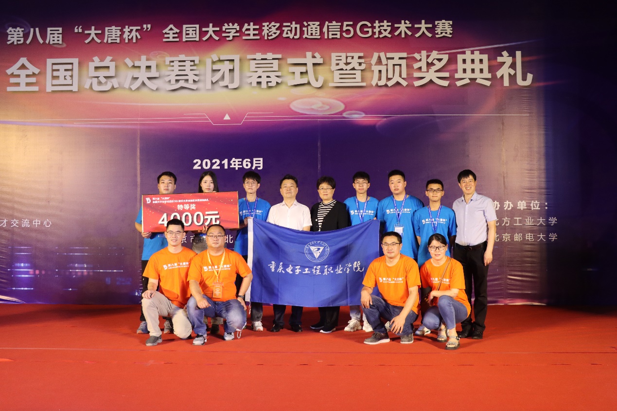 2021年6月28日,由工业和信息化部人才交流中心联合中国通信企业协会主办,大唐移动通信设备有限公司承办的第八届“大唐杯”全国大学生移动通信5G技术大赛全国总决赛在北京落下帷幕,通信工程学院师生再创佳绩,取得学生组(高职)竞赛全国特等奖1项、全国二等奖1项、全国三等奖4项,教师组竞赛获得全国一等奖1项目,全国二等奖1项,全国三等奖2项,在全国高职院校中遥遥领先。