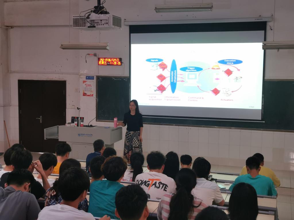会后徐俊鸿经理及马光红工程师以“智能制造趋势及挑战”为题向微电子技术专业学生作了专题讲座。讲座以英特尔公司集成电路智能制造真实案例,向学生讲解了集成电路制造发展趋势,智能制造在集成电路制造中的应用等科技前沿知识;学生就感兴趣的技术内容与专家进行了交流和互动。