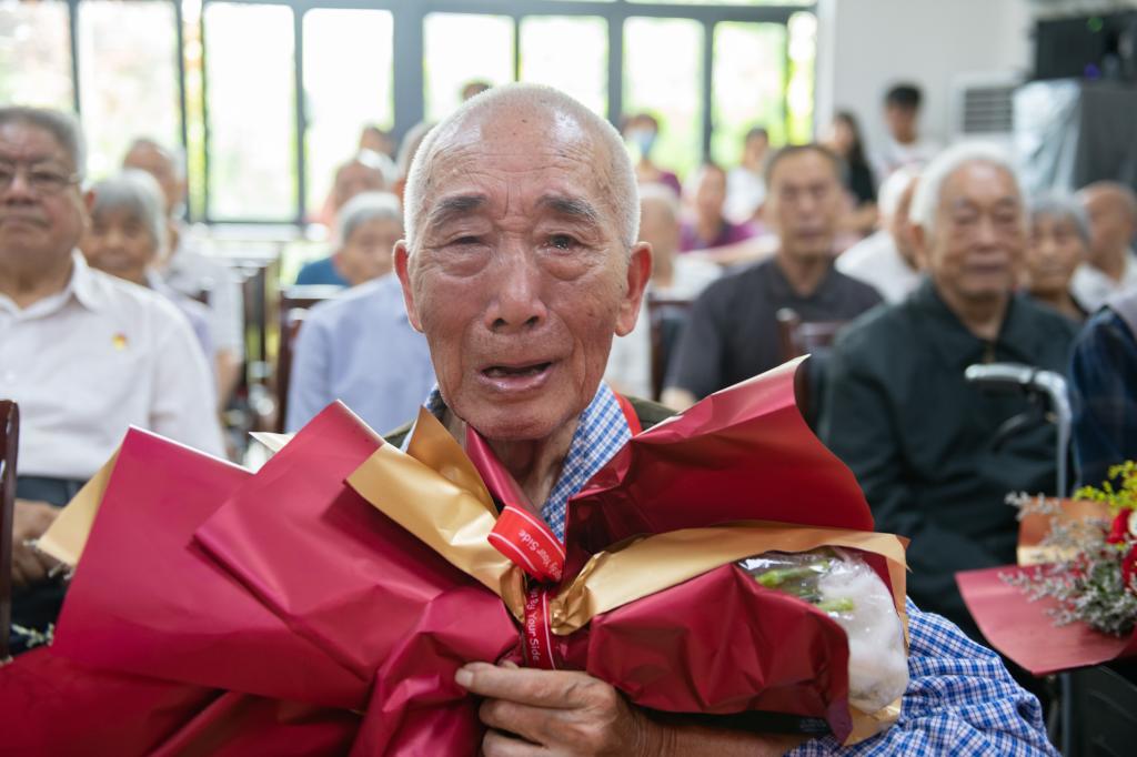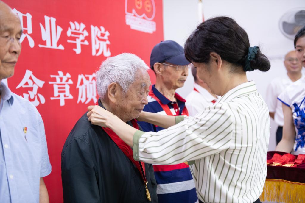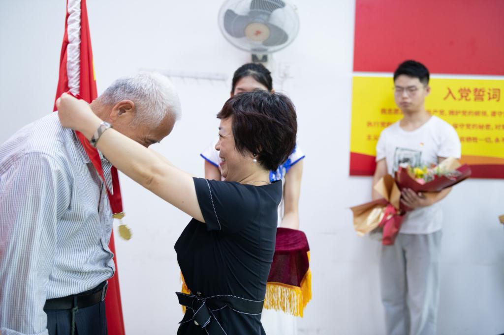 在座校领导为老党员代表颁发“光荣在党50年”纪念章,新党员师生代表向他们献花致敬。