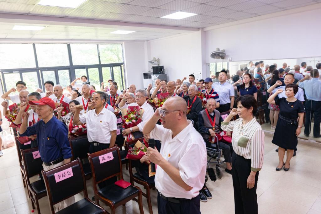 “光荣在党50年”纪念章颁发仪式现场气氛热烈而温馨,一句句铿锵的誓言,昭示着全体党员对党的忠诚;一双双深情的眼睛,饱含着对党的热爱;一幕幕感人的画面,尽显“重电”传承红色基因的美好篇章。