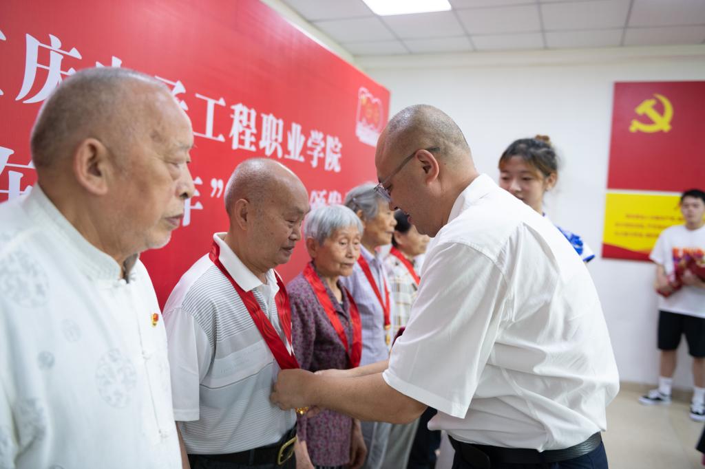 6月22日上午,重庆电子工程职业学院“光荣在党50年”纪念章颁发仪式在重电苑活动中心举行。获得纪念章的老党员代表,学校党委委员、纪委书记陈丽,校党委委员、副校长幸昆仑,校党委委员、副校长、工会主席谢义华,党委委员、党委组织统战部部长刘洪光,离退休党总支书记、工会副主席周鑫,工会副主席唐莉等领导,以及学校部分党组织代表、新党员师生代表参加了颁发仪式。颁发仪式由党委组织部干部人才科负责人黄婧雯主持。