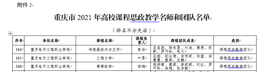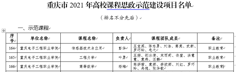近日,重庆市教委公布了《关于公布2021年高校课程思政示范建设项目名单的通知》(渝教高发〔2021〕8号),我校组织申报的《传感器技术与应用》《工程力学》《高等数学》共3个项目全部立项为市级课程思政示范项目,入选示范课程相应授课教师、团队自动认定为课程思政教学名师或教学团队。