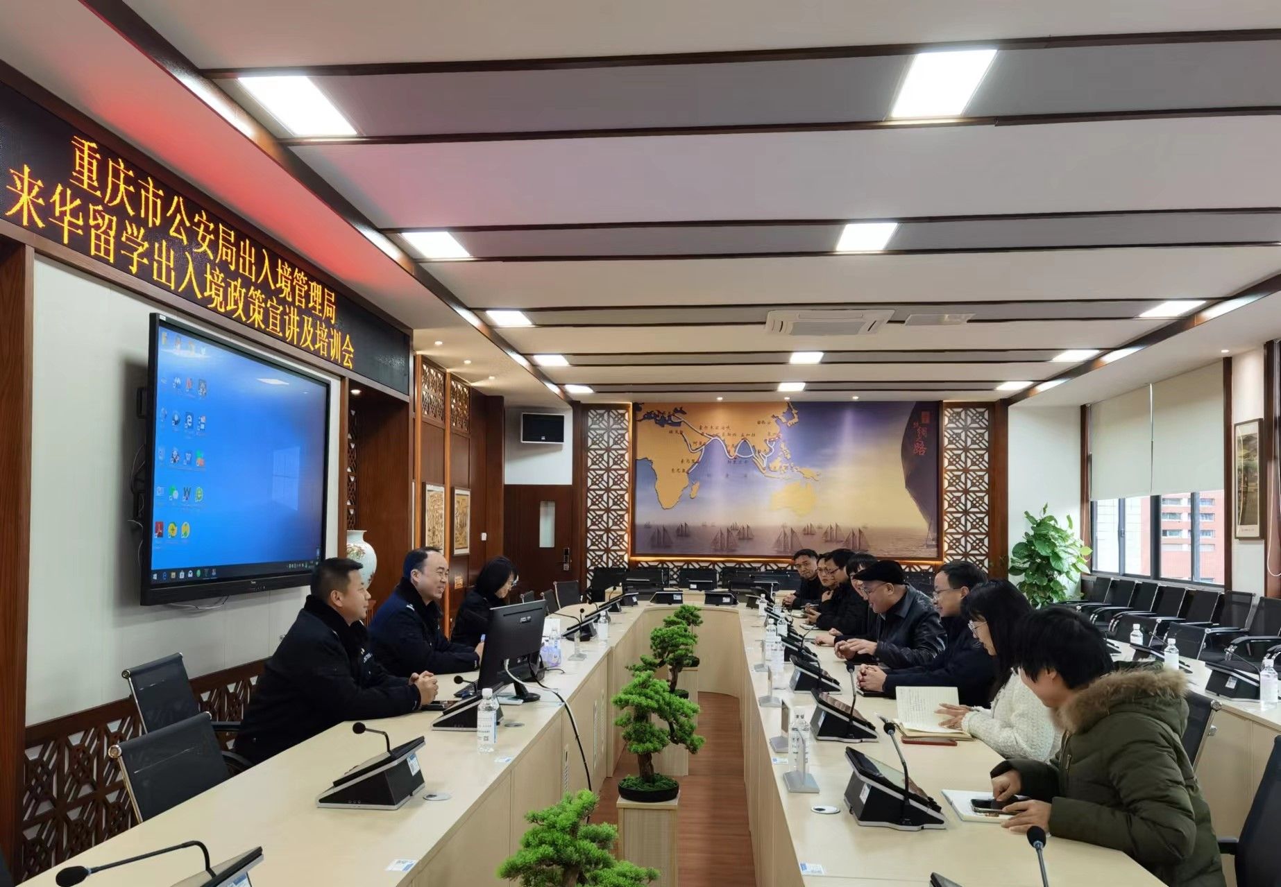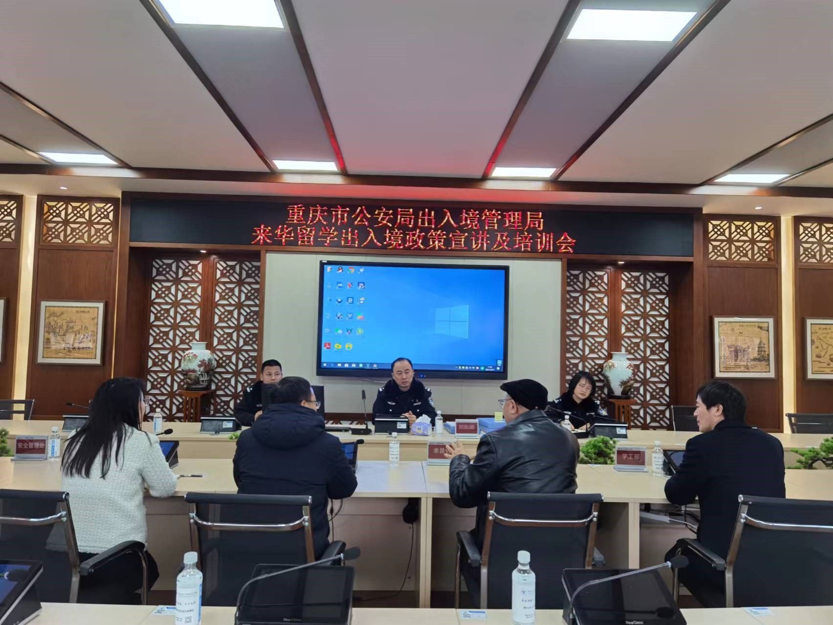 为做好来华留学生管理服务工作,加强学校从事来华留学管理工作人员对我国的出入境签证政策的了解,帮助来华留学生尽快适应在校的学习生活。2月26日,重庆市公安局沙坪坝区分局出入境管理支队邱建睿队长一行,深入我校开展“来华第一课”政策宣讲培训。学校副校长幸昆仑、党委学工部部长王永中、通识教育与国际学院院长沈雕、国际交流与合作发展处副处长刘影,安全管理处、留学生管理办公室相关负责人及专管员、留学生辅导员等在2307会议室参加了此次交流培训。