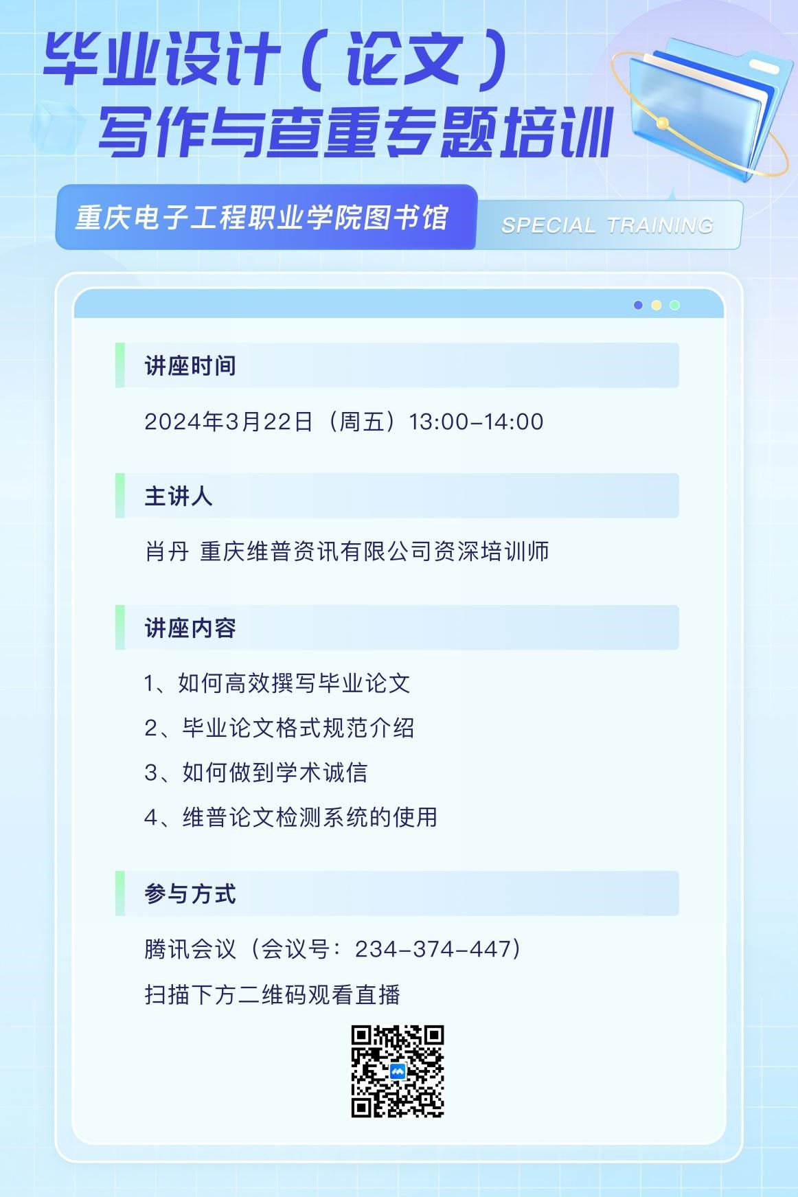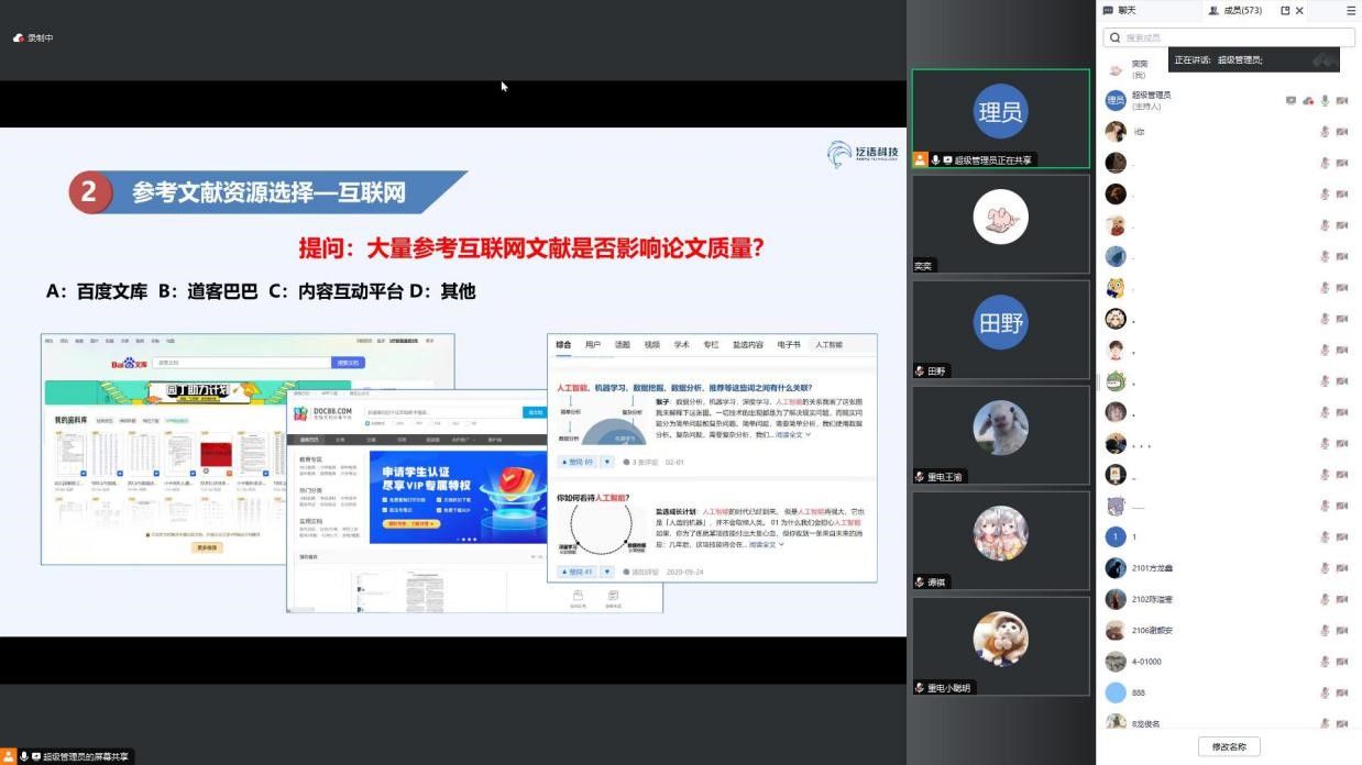 为助力毕业生论文写作,提升毕业论文质量和学术规范,2024年3月22日下午,我校图书馆联合重庆维普资讯有限公司开展了“毕业设计(论文)写作与查重”的线上专题讲座,为同学们的毕业论文(设计)写作排疑解惑,本次讲座共有近600名毕业生代表参与。