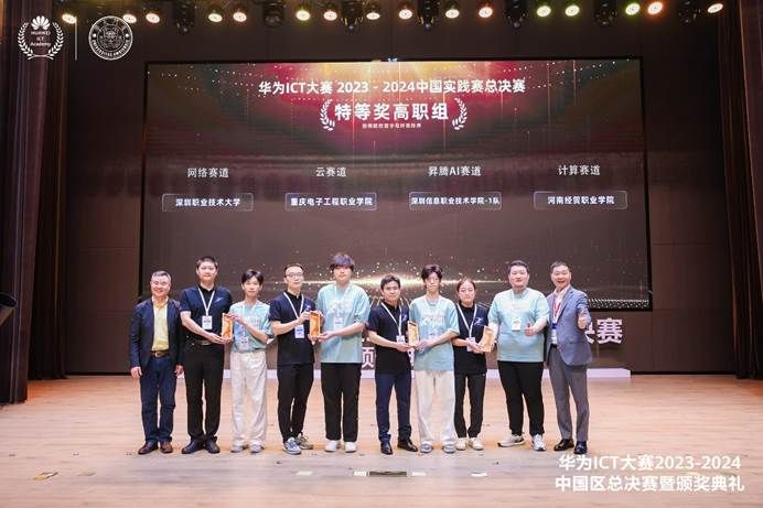 华为ICT大赛2023-2024全国总决赛于2024年3月9日-10日开展,比赛包括4小时上机实验和1小时理论比赛。参赛选手经过4个月的漫长备赛,并克服比赛时间与重庆市专升本考试时间接近的困难,学生们合理安排每天的专升本考试复习和大赛的备赛学习时间。经过师生共同努力,最终李饶老师指导的通运2104精英班学生余俊辉、李炜、宋清源获得云赛道全国特等奖。林勇老师指导的通信软件技术专业学生林俊吉、莫金凤、刘心怡获得昇腾AI赛道全国一等奖。郭俊杰老师指导的通信软件技术专业学生王涛、严皓文、董世超获得计算赛道全国一等奖。蔺玉珂老师指导的通运2104精英班学生谭嘉烨、周远达、樊祥平获得网络赛道全国二等奖。赵艳梅老师指导的通信软件技术专业曹桂豪、李奇富、秦明炜获得昇腾AI赛道全国二等奖。