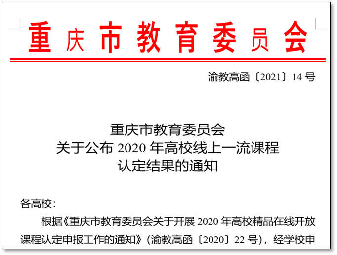 重庆市2020年高校线上一流课程评审认定结果已公布,全市本次认定线上一流课程162门,其中,我校《毛泽东思想和中国特色社会主义理论体系概论》《财务会计实务》《探秘传感器世界》《网球运动学与练》《PTN光传输设备运行与维护》《信息技术与人工智能基础》6门课程通过“重庆市2020年高校线上一流课程”认定。