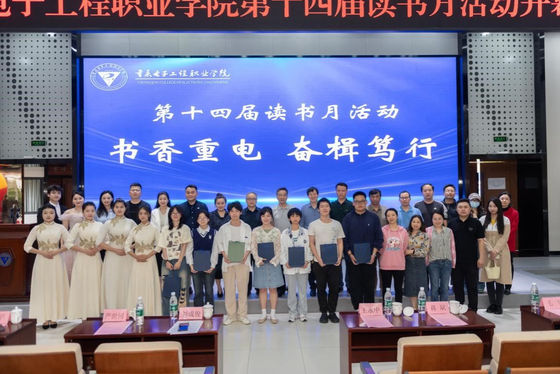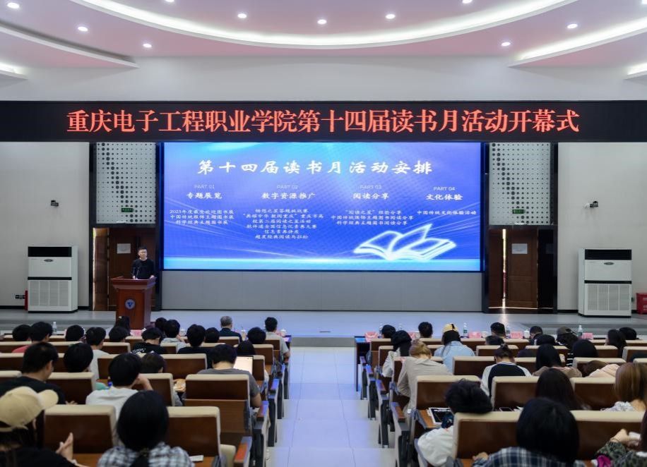 4月23日,重庆电子工程职业学院第十四届读书月活动开幕式在博远厅举行。学校副校长刘成俊,党委宣传部、党委学生工作部、校团委、电子与物联网学院、智能制造与汽车学院、财经管理学院、人工智能与大数据学院、图文信息中心等部门相关负责人及各二级学院师生代表200余人参加本次活动。