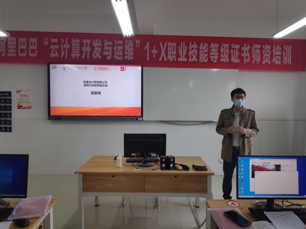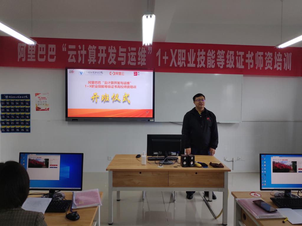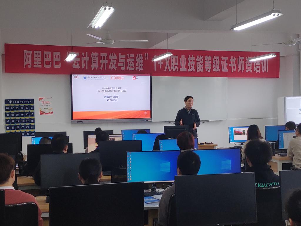4月12日,我校承办的阿里巴巴“云计算开发与运维”1+X职业技能等级证书高校师资培训在我校人工智能与大数据学院顺利开班,开班仪式由云计算与大数据系主任李腾主持,人工智能与大数据学院院长武春岭、阿里云计算有限公司西南大区教育副总监谭黎明、阿里云合作伙伴重庆隆锦科技有限公司总经理钟世成、阿里云计算资深讲师王震,以及全体参培学员出席了开班仪式。
