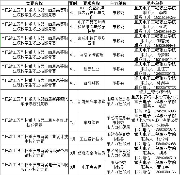 根据重庆市高技能人才工作联席会办公室发布的《重庆市高技能人才工作联席会办公室关于印发“巴渝工匠”杯2021年全市系列职业技能竞赛计划的通知》和市教委竞赛办发布的《“巴渝工匠”杯重庆市第十四届高等职业院校学生职业技能竞赛项目名单》,我校获批承办“HTML5交互融媒体内容设计与制作”等11个市赛赛项。