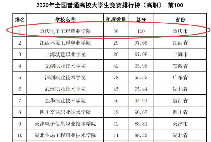 近日,中国高等教育学会发布2020年全国普通高校大学生竞赛排行榜(高职),重庆电子工程职业学院排全国第一!这是我校“双高”建设和“提质培优”计划实施以来取得的又一重要成果,充分肯定了我校师生在学生竞赛工作方面的辛勤付出!