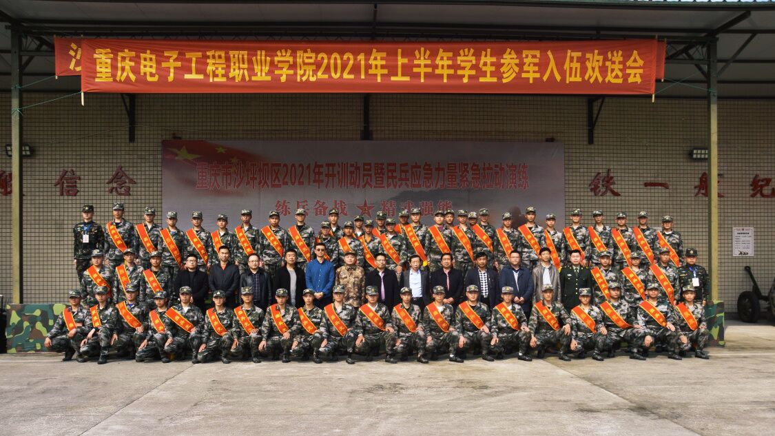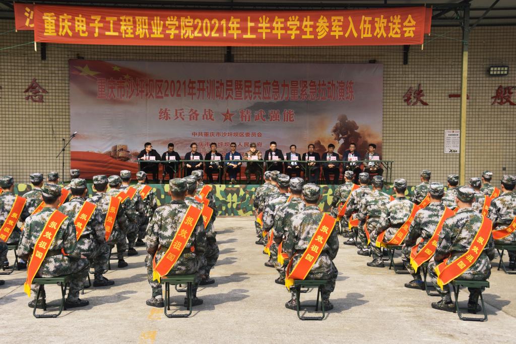 2021年3月15日,重庆电子工程职业学院在沙坪坝区武装部国防训练基地,举行2021年春季新兵参军入伍欢送大会。 沙坪坝区区常委、人民武装部政委刘星大校,副校长冉学农教授,党委学生工作部部长何光明教授,校人民武装部部长谯新风,校人民武装部副部长田艾以及各二级学院总支书记(副书记)参加欢送会。