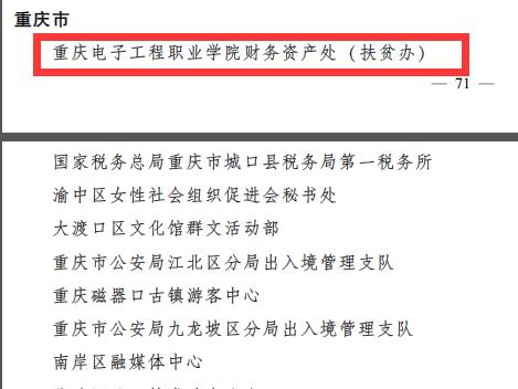 在三八国际劳动妇女节到来之际,全国妇联表彰了一批在决胜全面建成小康社会、决战脱贫攻坚以及新冠肺炎疫情防控中,为国家经济社会发展贡献巾帼力量的先进集体和个人,其中,作为重庆市高校唯一获此殊荣的学校,我校财务资产处(扶贫办)被全国妇女联合会授予“全国巾帼文明岗”荣誉称号。
