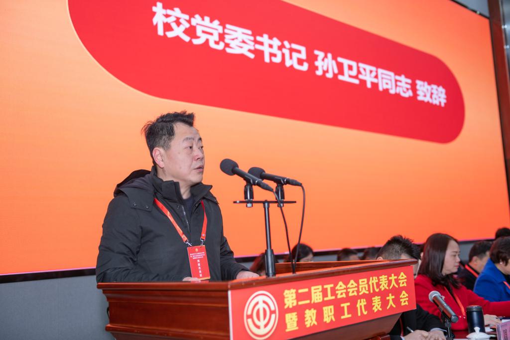 学校党委书记孙卫平代表学校党政致辞,他肯定了第一届工会教代会紧紧围绕学校中心工作,充分发挥了桥梁纽带作用,团结带领全校教职工,群策群力推进了学校各项工作的顺利开展,为推动学校事业不断迈上新台阶做出了应有的贡献。孙书记指出,2021年,是“十四五”开局之年,也是中国共产党建党100周年,是我们在经历极不平凡的2020年,冲破艰难险阻,充满信心迈向新征程的一年,是我国现代化建设进程中具有特殊重要性的一年,他希望通过此次会议,更好地把大家的智慧与力量凝聚起来,进一步推动学校依法治校、民主管理,进一步团结广大教职员工,共同促进学校各项工作更上一层楼,为学校高质量发展作出新的更大贡献!