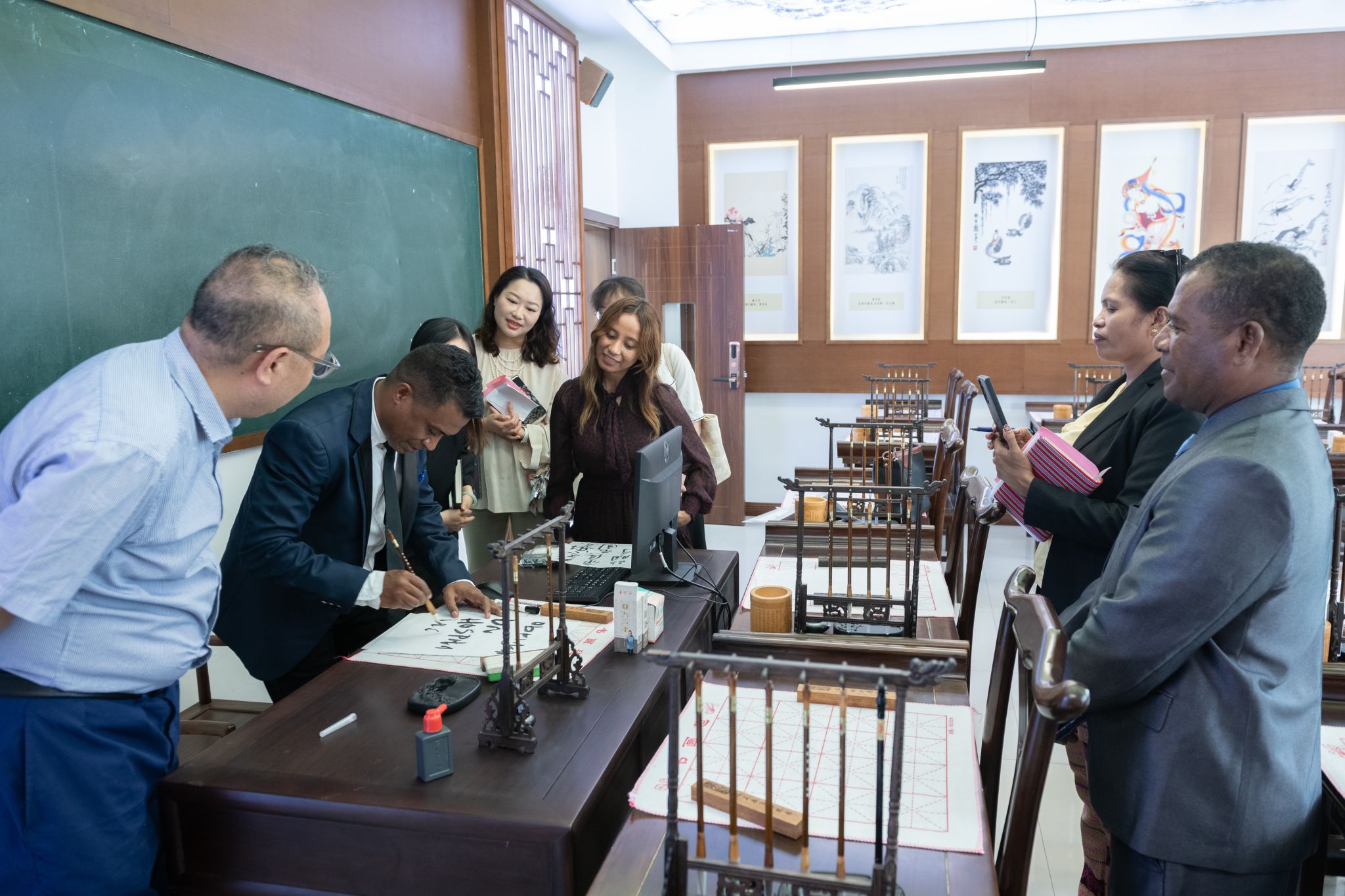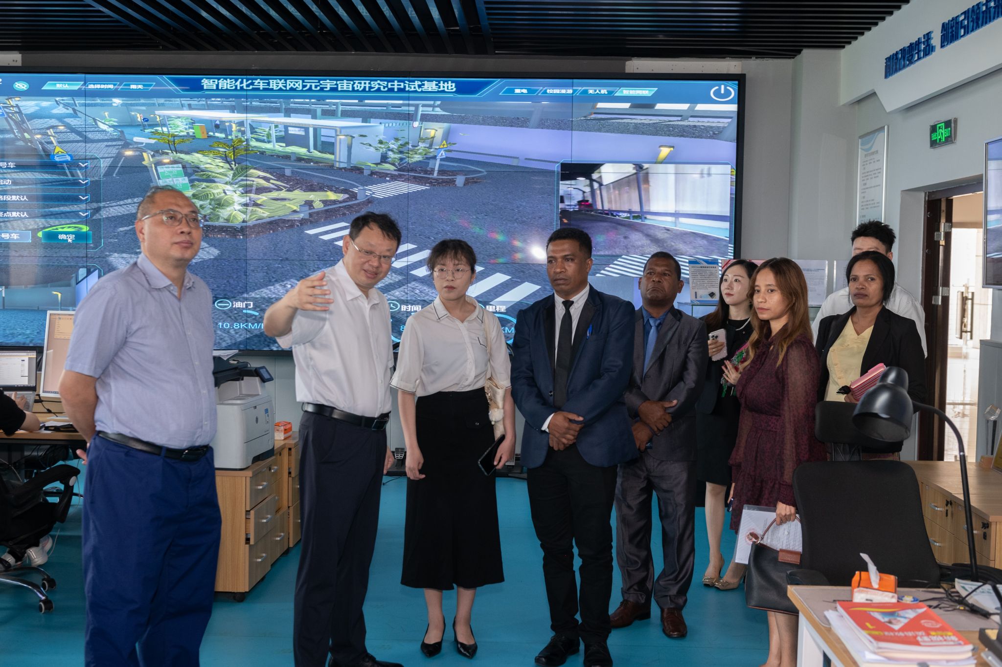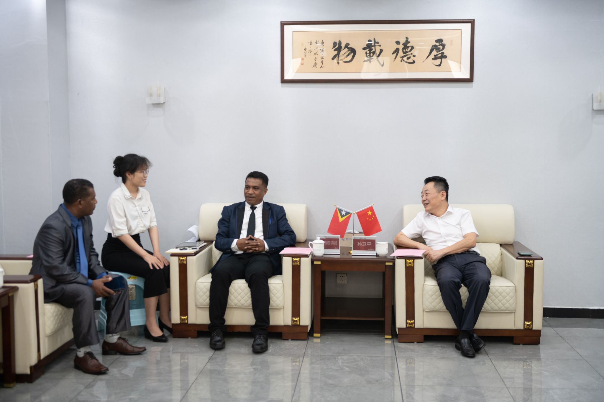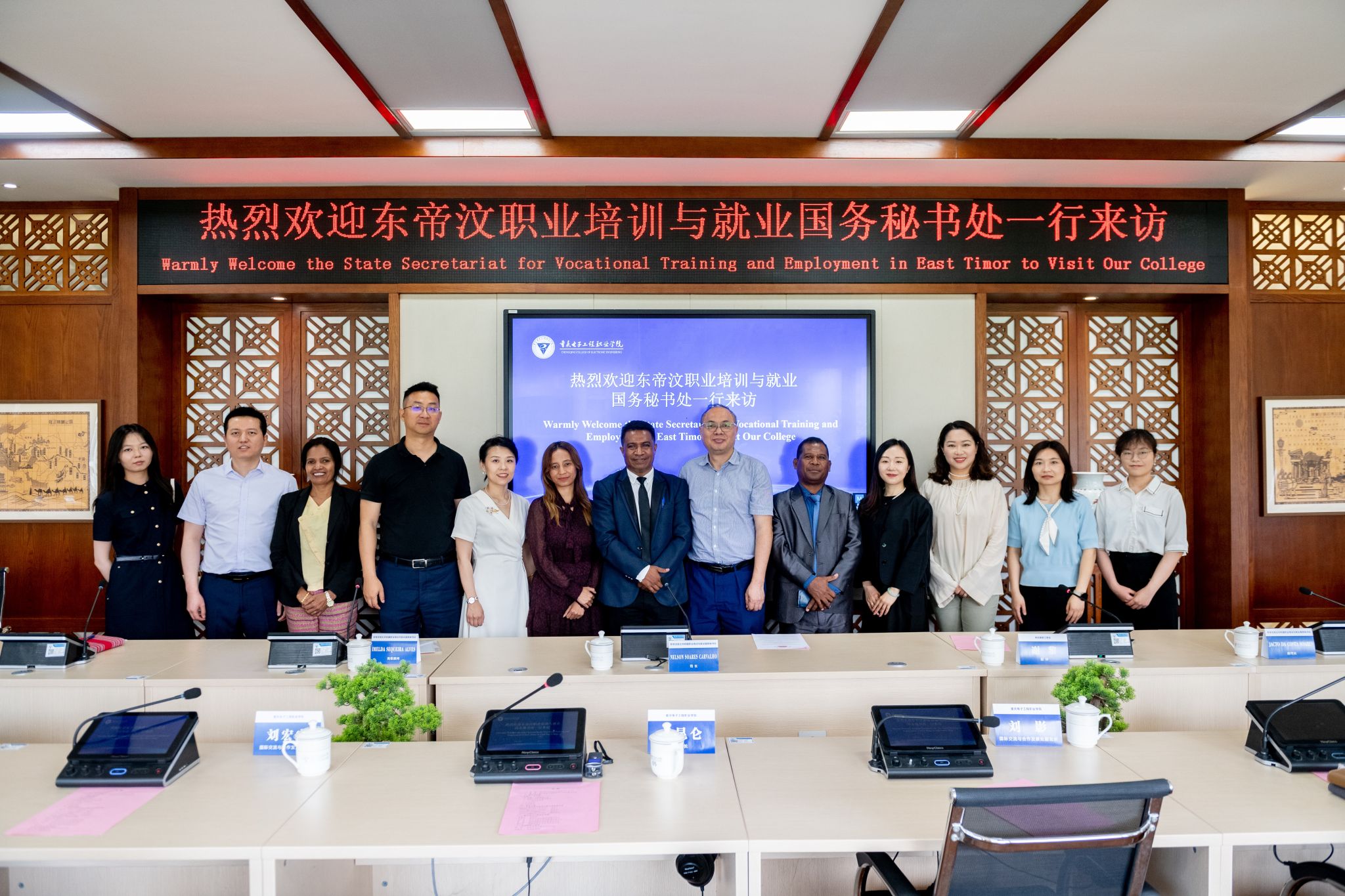各方首先在室语厅齐聚一堂,深入探讨国际职业教育合作前景,并就未来的合作计划进行了充分交流。孙卫平书记围绕我校在职业教育国际化领域的设施、课程、师资建设等方面的成果和优势,向来访嘉宾进行了详细介绍,并表达了与东帝汶在留学生培养、师资培养等领域开展合作的美好期待。东帝汶方面也介绍了该国在职业教育领域的有关进展,表示希望能够在电子信息、人工智能等急缺领域与我校开展深度合作,切实提升本国经济社会发展水平。交流期间,孙卫平书记代表学校向来访嘉宾赠礼,并合影留念。