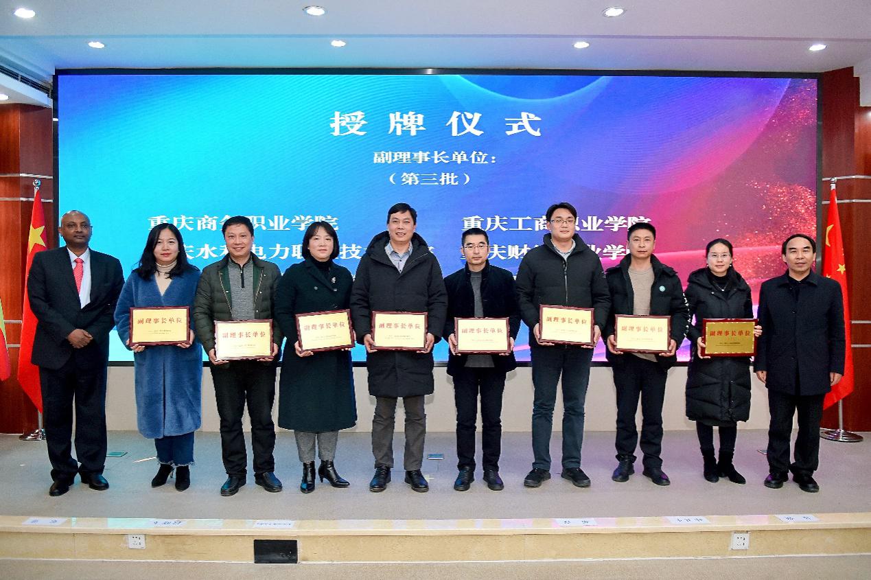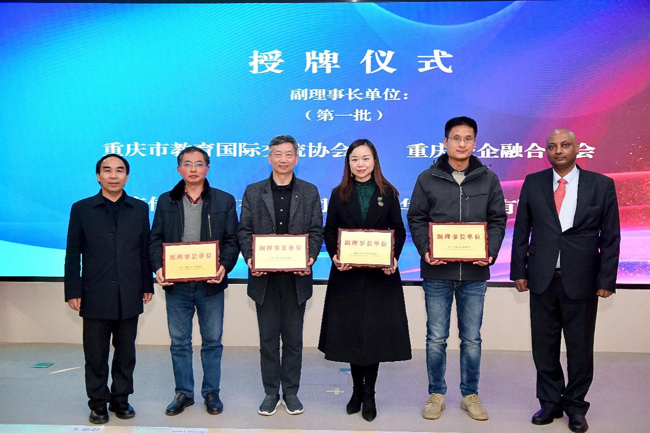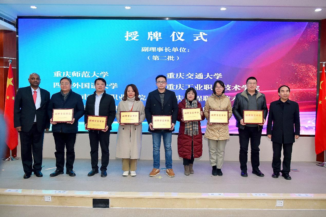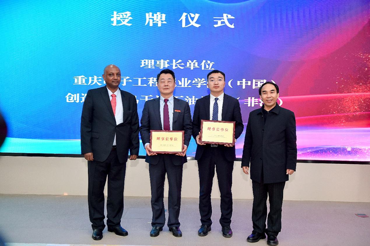 重庆市教育委员会邓睿副主任、埃塞俄比亚驻重庆总领事馆总领事安特能·塔瑞库·菲勒克为理事长单位及副理事长单位授牌