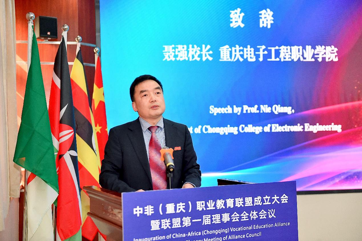 重庆电子工程职业学院校长聂强代表全校26000余名师生,向联盟的成立表示热烈的祝贺,聂强校长向参会人员介绍了学校的基本情况和学校开放办学的成果。聂强表示,相信在中非双方理事长的带领下,联盟在搭建工作机制、促进中非人文交流、共建共享合作办学资源等方面将取得新成果。
