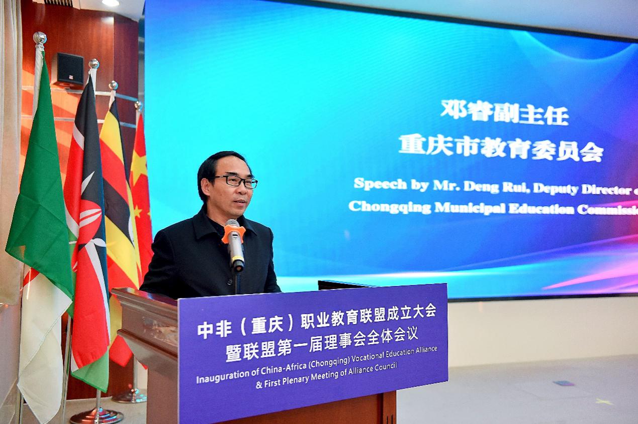 重庆市教育委员会副主任邓睿代表重庆市教育委员会对联盟的成立表示祝贺,向东非共同体高等教育委员会、埃塞俄比亚驻重庆总领事馆、兄弟省市院校长期以来对重庆教育和教育对外开放事业的支持表示感谢。