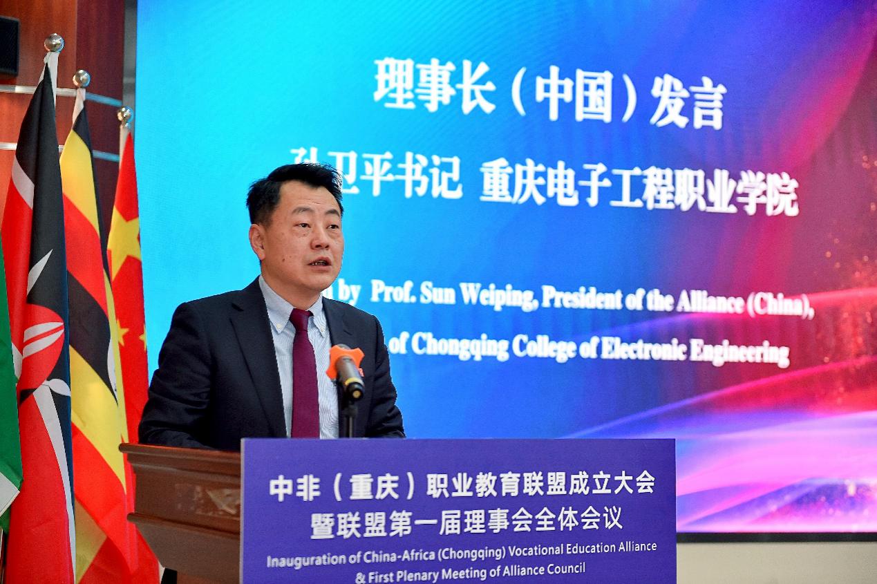 联盟(中国)理事长重庆电子工程职业学院党委书记孙卫平在发言中表示,将切实履行好职责,与联盟(非洲)理事长一同为所有理事单位做好服务工作,并对联盟近期工作提出以下三点设想,一是推动一批重庆市中高职院校,去联合重庆驻非企业在非洲建立具有重庆特色的海外分校和职业技术技能培训中心,推动重庆院校与非洲中高职院校学分学历互认;二是根据共商、共建、共享的原则,建设ICT(信息通讯技术)、物联网等行业国际化教学资源包,并在非洲国家推广认证;三是培养一批非洲国家职业院校的师资队伍,并对其进行考核、鉴定和认证,形成一套完善的境外办学项目本地化师资队伍培训体系、考核和认证标准。