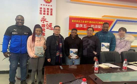 在沟通交流中,张进春院长对学校基本情况和留学生项目的具体执行情况进行了介绍;重庆狼道科技有限公司技术部部长刘方园和重庆闰多精密机械有限公司制造部部长冯燕分别对南非留学生的实习情况进行了说明;智能制造与汽车学院向南非留学生赠送了学院编写的英文教材;最后6名学生代表与南非培训署进行了交流,并就学生关切的问题进行了解答。