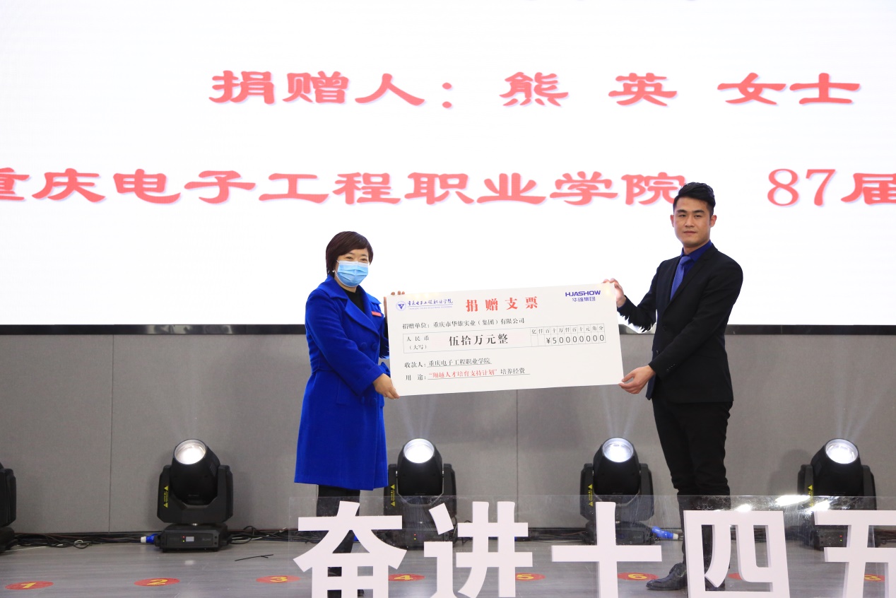 1987届校友熊英女士携重庆市华雄实业集团有限公司捐资设立“重电-华雄校友励教基金”,定于2020年起,每年向学校捐赠10万元人民币,纳入重电“翔越人才培育支持计划”培养经费,谢义华副校长与华雄校友企业代表付强先生进行捐赠仪式!