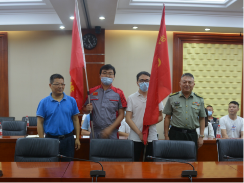 最后,会议进行庄严的授旗仪式,刘政委和冉校长分别向无人机侦察排、GPS干扰排授旗。