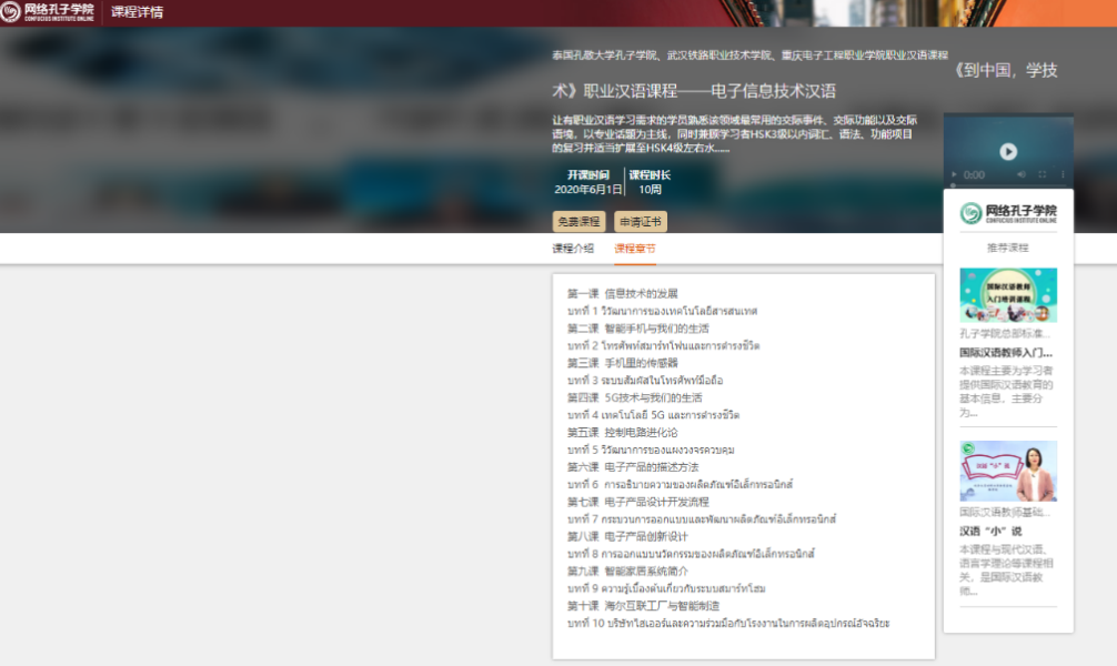 由电子与物联网学院刘睿强、付渊老师与通识教育与国际学院汤婷老师共同参与制作的泰国孔敬大学孔子学院《到中国,学技术》——电子信息技术职业汉语在线课程,在国家汉办网络孔子学院平台顺利上线。