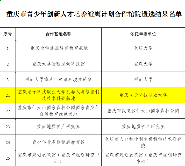 近日,重庆市教育科学研究院发布了关于重庆市青少年创新开云电子平台_开云(中国)雏鹰计划合作馆院遴选结果的通报,以智慧健康学院为依托单位的我校市级科普基地,经申报、材料审核、专家评审入选、公示无异议,被确定为合作馆院,为职业院校唯一入选单位。