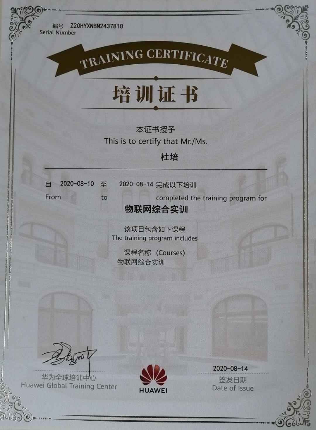 当前科技发展十分迅速,电子信息及物联网新技术应用层出不穷。秉承高质量实施“双高”专业建设任务要求,学院“走出去引进来”同步进行,加强与行业领军企业的联系互动。8月10日至15日,华为全球培训中心在杭州市举办了物联网综合实训培训班,电子与物联网学院信息工程系专任教师杜培、高辉利用暑期空档,前往参加培训,力图为师资队伍等专业建设进程添砖加瓦。
