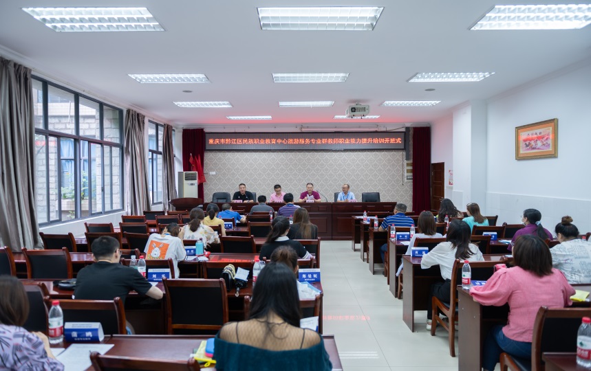 7月21日上午,重庆市黔江区民族职业教育中心旅游服务专业教师职业能力提升培训班开班式在我校国培基地1-101室举行。培训与继续教育中心主任陈志军、智慧健康学院院长谢光辉、以及来自重庆市黔江区民族职业教育中心的24名旅游服务专业教师参加开班式。开班式由培训与继续教育中心继续教育科负责人张亚主持。