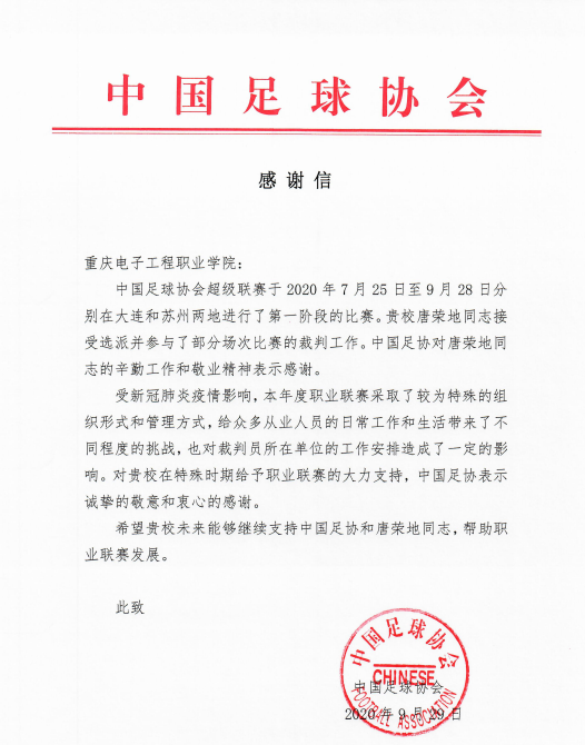 我校体育与国防教学部唐荣地老师受中国足球协会委派参加2020年中国足球超级联赛裁判执法工作,因受新冠肺炎疫情影响,今年中国足球超级联赛由主客场制调整为赛会制,唐荣地老师8月20日赴大连赛区报到于9月28日返回重庆,期间一共执法7场中超联赛1场足协杯,由于特殊情况下的赛制裁判员面临着前所未有的压力和全社会的期望,经过所有裁判员的努力顺利完成中超联赛第一阶段任务。